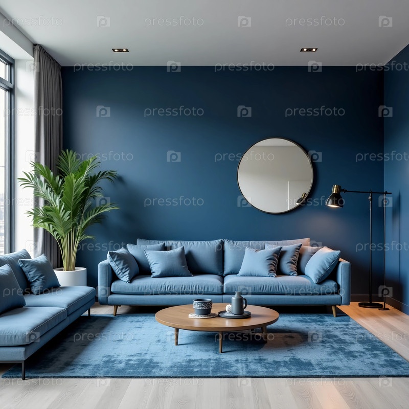 Яркое и прозрачное пространство демонстрирует шикарную синюю гостиную с плюшевым диваном, круглым зеркалом и пышной зеленой средой, приглашая к релаксации и спокойствию в дневное время Generative AI