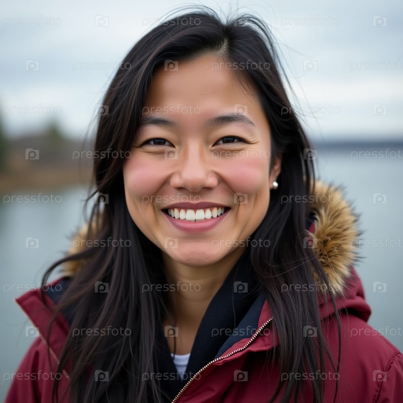 Веселая жительница Аляски стоит у безмятежной реки, ее теплая улыбка светит в прохладном облачном небе