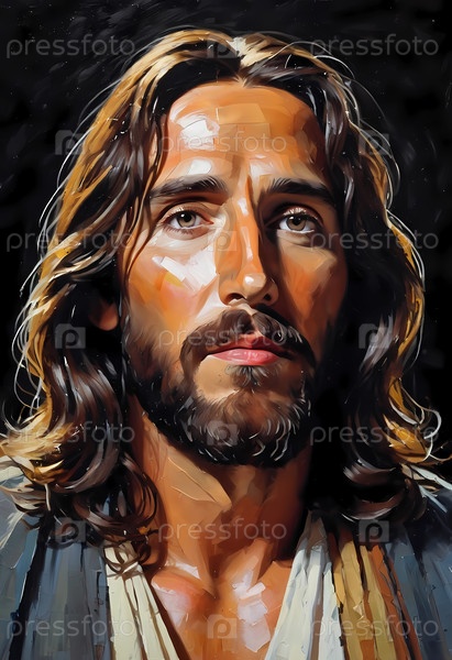 Христос выражает любовь и мудрость, демонстрируя свои гладкие волосы и спокойное поведение.Очаровательное освещение подчеркивает его нежные черты, создавая момент божественного отражения