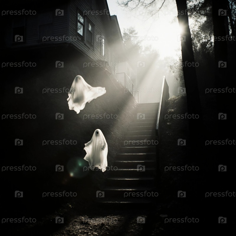 Два полупрозрачных привидения дрейфуют вниз по тенной лестнице в лесу.Сцена освещается мягким светом, создавая жуткую и таинственную атмосферу Хэллоуина