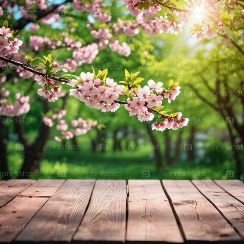 Деревянный стол стоит перед размытым фоном весеннего сада. Цветы на ветке достигают солнца, который ярко светит сквозь листья. Копирующее пространство для демонстрации продукта. AI