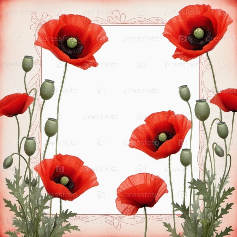 Красный мак с зелеными листьями и стеблями.Маки изображаются на различных стадиях цветения, некоторые полностью открыты, а другие в зародыше.Мягкая спина, создающая деликатное и романтическое ощущение
