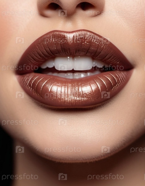 Близкий снимок женских губ с блестящей коричневой бежевой помадой, которая добавляет прикосновение глянца. губы слегка расставлены между собой и открывают вид на белые зубы. сексуальность чувственности: генерируется