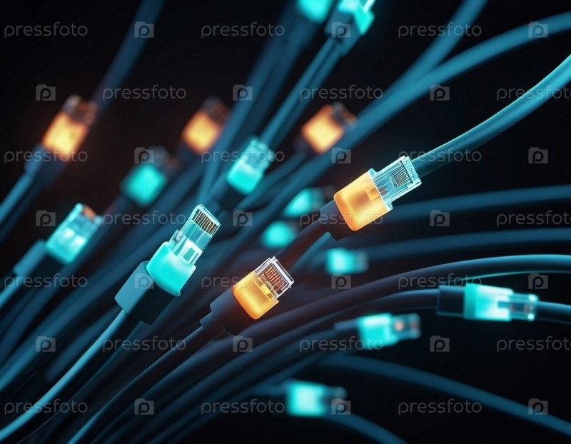 Синие и оранжевые светящиеся провода скручиваются и переплетаются на темном фоне с боке.Черные кабели и разъемы со светящимися огнями и цепями соединяются, образуя сеть