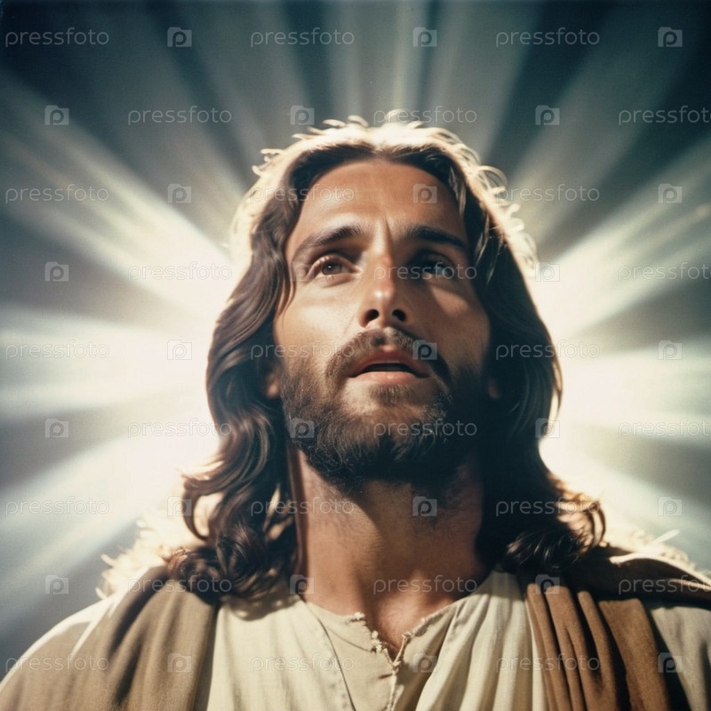 Портрет мужчины, одетого в Иисуса. Белое пальто. Длинные коричневые волосы и борода. Мужчине, по-видимому, около 30 лет и серьезное выражение лица. Христианская религия и вера