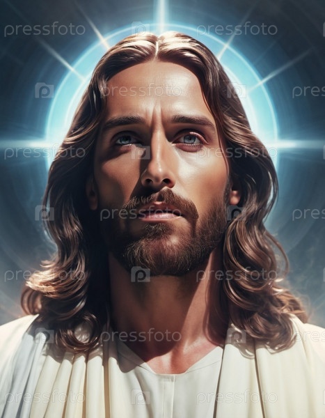 Портрет мужчины, одетого в Иисуса. Белое пальто. Длинные коричневые волосы и борода. Мужчине, по-видимому, около 30 лет и серьезное выражение лица. Христианская религия и вера
