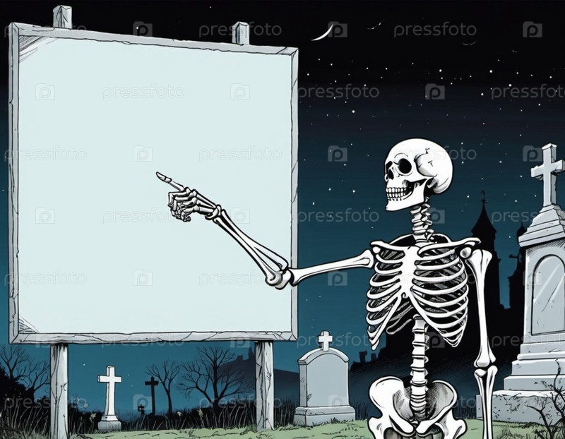 фигура скелета держит белый плакат. сгибающиеся руки скелета предоставляют достаточно места для любого сообщения или дизайна. скелет предлагает что-то. тема Хэллоуина. AI