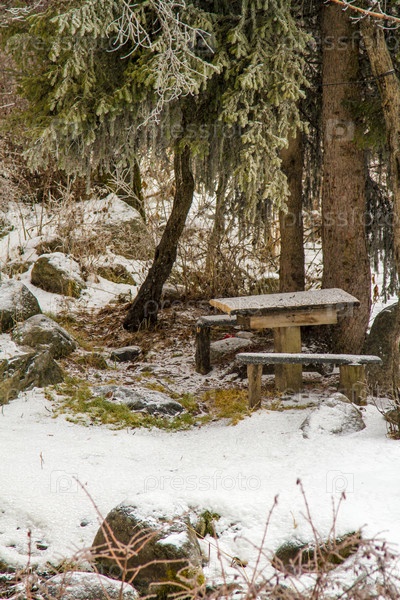 Стол и скамейки для пикника в снегу в Казахстане, Алматы