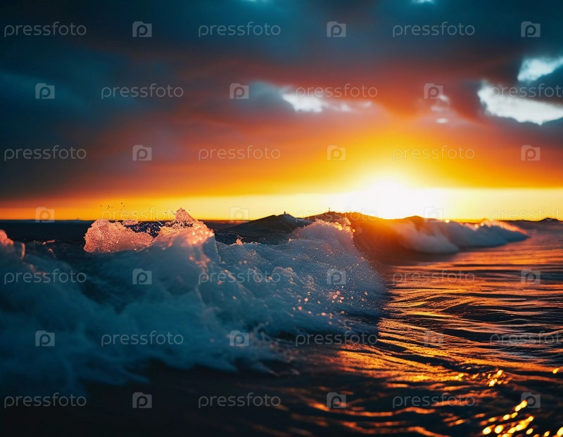 Горизонт светит ярко-оранжевыми и красными, когда волны мягко падают на берег, отражая теплые цвета заходящего солнца на спокойной поверхности океана