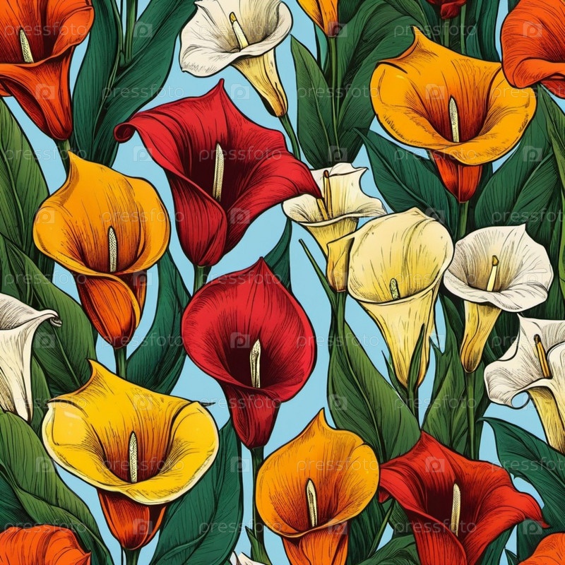 Ярко окрашенные каллы в оттенках красного, желтого, оранжевого и фиолетового цветов заполняют холст среди пышных зеленых листьев на ярко-синем фоне, создавая привлекательный цветный дисплей