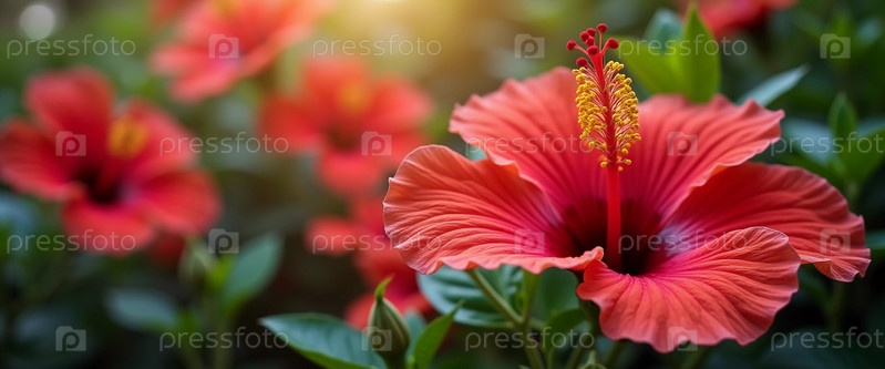 Ярко-красные цветы гибискуса демонстрируют сложные лепестки в цветном саду. пышная зелень создает яркий фон для их красоты. Гибискус - большой род растений из семейства Malvaceae