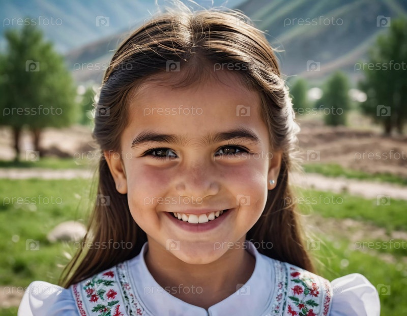 Молодая улыбающаяся 5-летняя девочка таджикской национальности стоит на улице, одетая в традиционную одежду