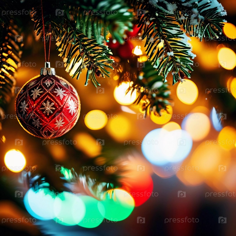 Красочные рождественские украшения украшают ветви елки, яркие шары в оттенках красного и розового цвета, олицетворяющие праздничное настроение зимой