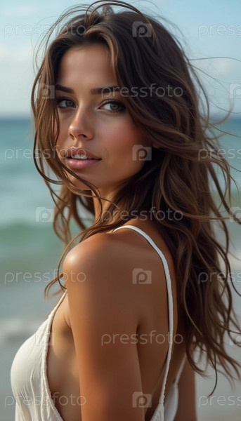 Брюнетка в купальнике оглядывается назад, стоит рядом с береговой линией. Нежные морские волны поднимаются к ее ногам под чистым голубым небом. Длинные волосы, красивое молодое лицо. Путешествия и реклама одежды