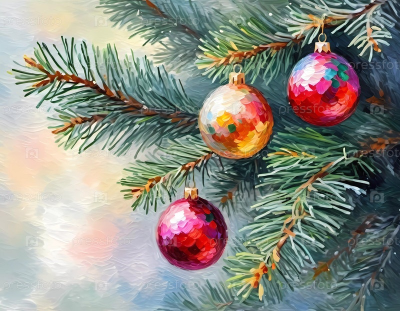 Сверкающие декоративные шары в ярко-красном и золотом цветах висят на ветке пышной ель. Мягкие, теплые огни мерцают, улучшая праздничный дух Рождества. Счастливого Нового года. Художественный рисунок. Генерация ИИ
