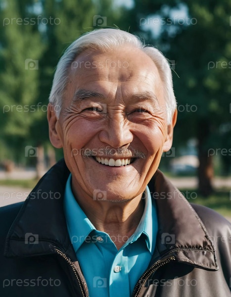 Пожилой человек, одетый в светлую куртку и синюю рубашку, ярко улыбается, показывая счастье и удовлетворение в природной окружающей среде на протяжении всего дня