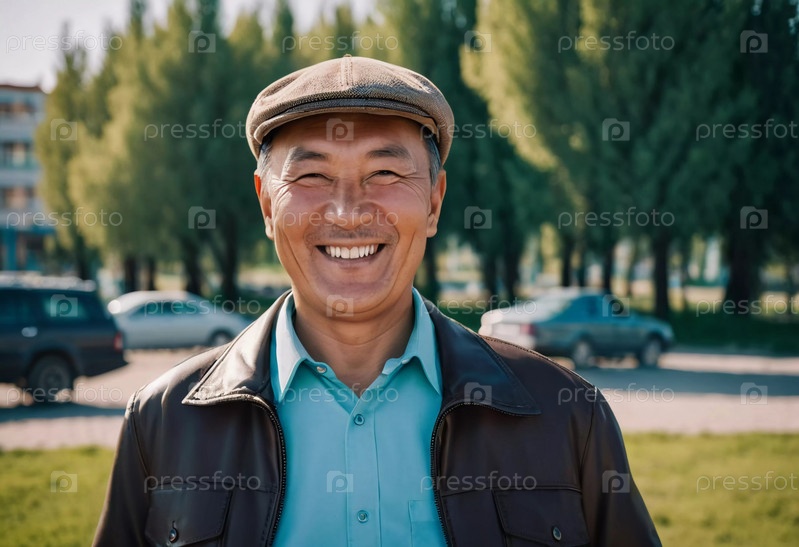 50-летний мужчина с искренней улыбкой стоит снаружи в оживленном районе, демонстрирует дружественное поведение и наслаждается прекрасным днем среди ярких окрестностей