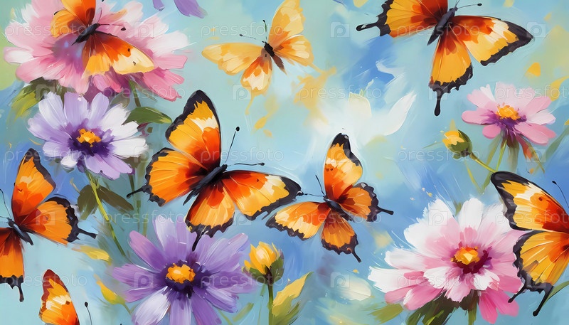 Красочные бабочки грациозно парили над ярким массивом диких цветов, создавая живую и веселую атмосферу на солнечном лугу