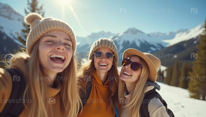 Друзья наслаждаются солнечным днем на горнолыжном курорте, улыбаясь и смеясь, пока они снимают веселый момент вместе