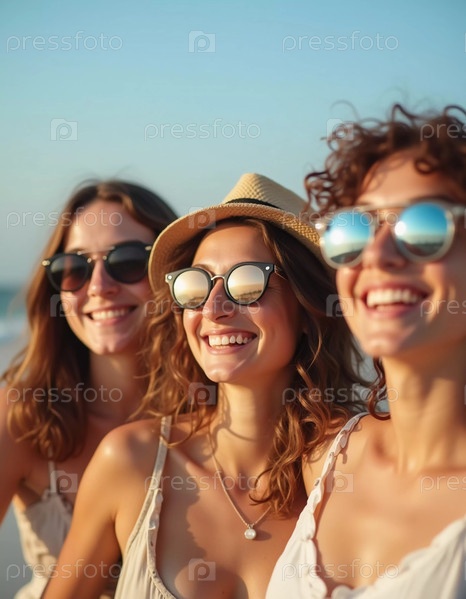 Друзья наслаждаются солнечным днем на пляже, улыбаясь и смеясь во время совместного запечатления веселого момента. Голубое небо дополняет их радостный дух и летнюю атмосферу. Белый песок. Генерация ИИ