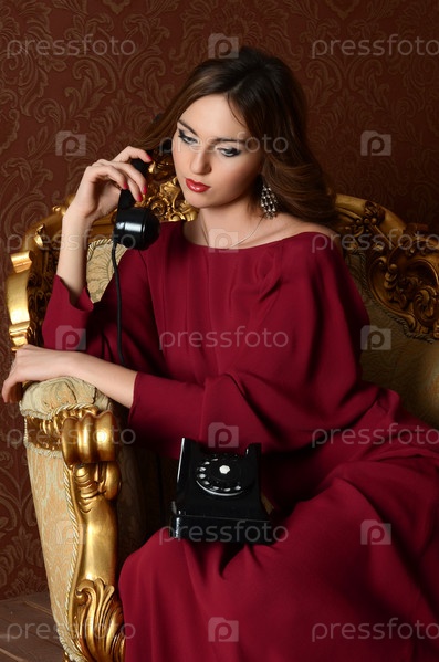 Элегантная чувственная молодая женщина в бордовом платье