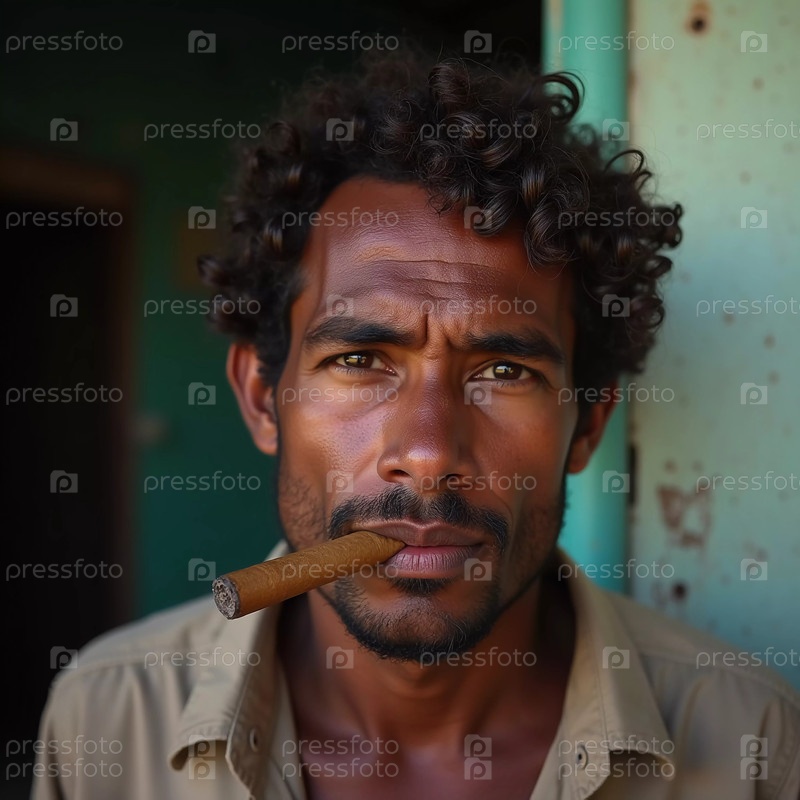 Молодой человек из Кубы уверенно курит сигару, представляющую богатое культурное наследие региона. Его расслабленное выражение отражает непринужденный образ жизни, типичный для этого района