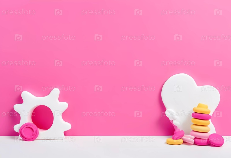 Красочные игровые формы Doha установлены на ярко-розовом фоне, с уникальным дизайном и игривым складированием различных цветных объектов для художественного эффекта