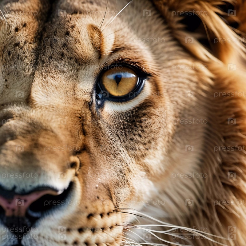 Глаза льва демонстрируют яркий янтарный цвет и мощное выражение лица. Животное спокойно, но бдительно, воплощая свою дикую природу среди зелени. Детальное меховое покрытие и яростный взгляд в естественной среде обитания. Генеративная ИИ
