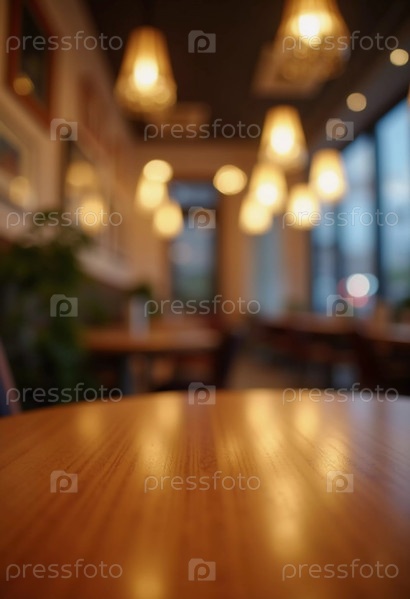 Теплый деревянный стол создает уютную атмосферу в шумном кафе. Мягкие огни освещают фон, где посетители наслаждаются напитками и разговорами