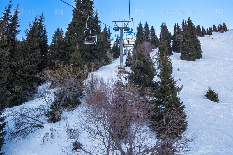 Кресельная канатная дорога в горах зимой в Азии. Ак Булак, Алматы, Казахстан