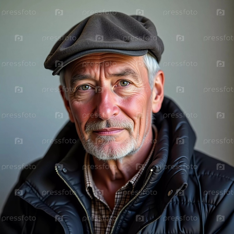 Пожилой мужчина в шляпе и темном куртке спокойно сидит на слабо освещенном фоне.Его выражение передает теплоту и мудрость, демонстрируя хорошо прожитую жизнь
