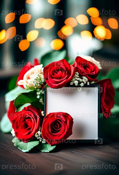 Красивый набор красных роз окружает открытку, которая идеально подходит для выражения романтических чувств
