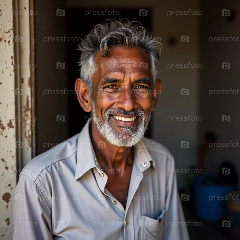Пожилой мужчина сияет от радости, когда он стоит за пределами своего дома в Индии, демонстрируя мудрость и теплоту.Солнечный свет подчеркивает его дружественное поведение, создавая трогательную атмосферу