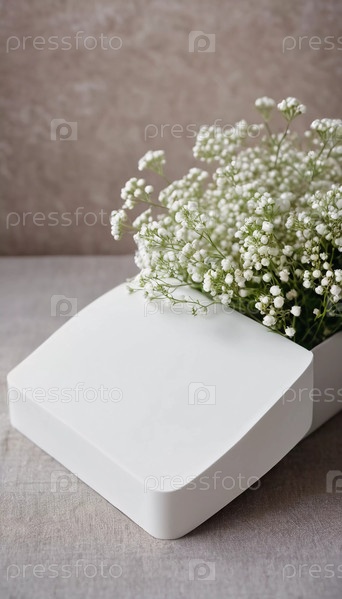 Красивые гипсофильные белые цветы, изящно расположенные в гладких белых плантаторах, создают спокойную атмосферу, идеально подходит для улучшения декора любой комнаты и призывает к душевному миру в помещении