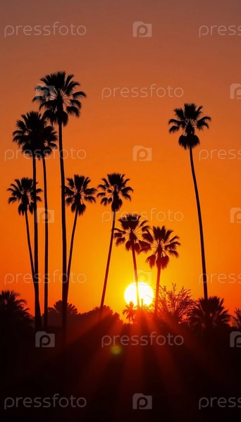 Когда солнце опускается ниже горизонта, высокие пальмы создают яркий силуэт на фоне светящегося апельсинового и розового неба, вызывая чувство спокойствия и красоты