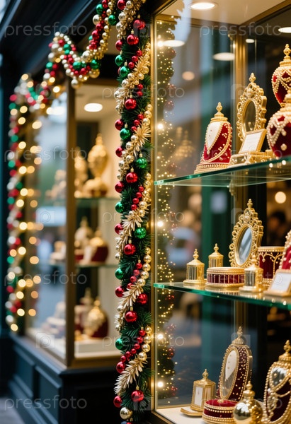 В праздничной витрине изысканные декорации сияют сквозь стеклянные дисплеи, украшенные рождественскими украшениями