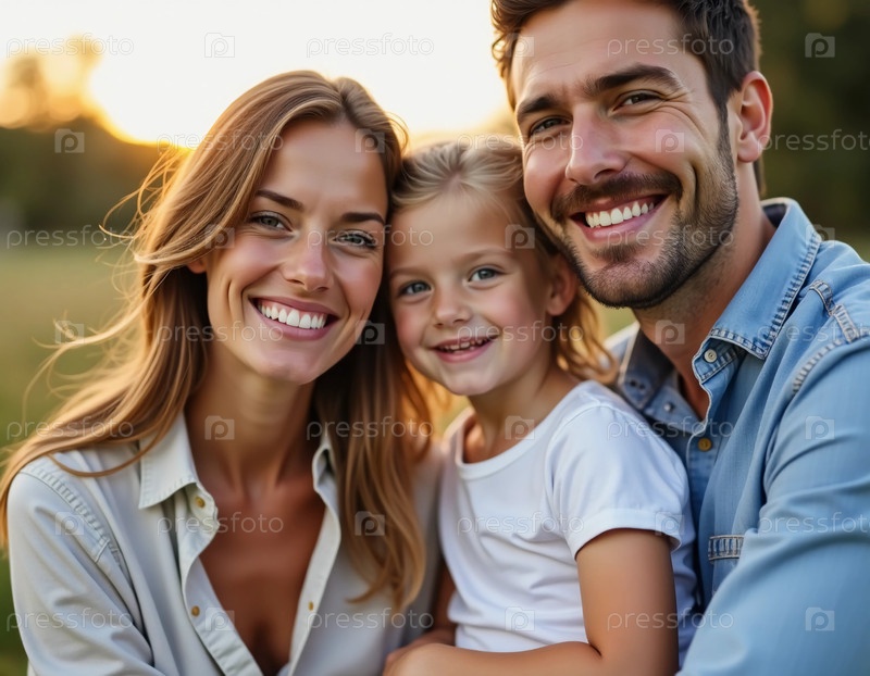 Мама и папа обнимают своих детей в пышном зеленом парке, тёплый солнечный свет излучает золотистое свечение