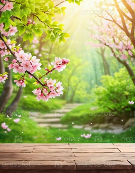 Деревянный стол сидит перед размытым фоном весеннего сада. Розовые вишневые цветки на ветке достигают солнца, который светит сквозь листья. Копирование пространства для демонстрации продукта. AI