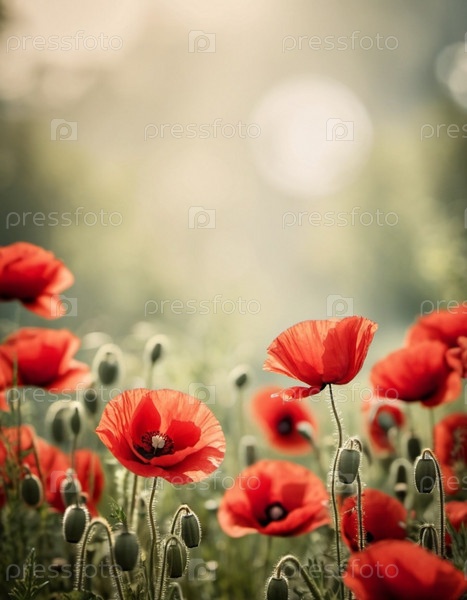 Красный мак с зелеными листьями и стеблями.Маки изображаются на различных стадиях цветения, некоторые полностью открыты, а другие в зародыше.Мягкая спина, создающая деликатное и романтическое ощущение