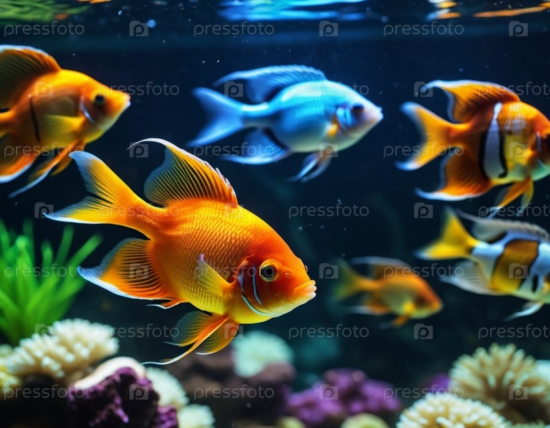 Красочные рыбы грациозно плавают в хорошо освещенном аквариуме. Танк украшен кораллами, растениями и щебнем, создавая яркую подводную сцену. Подводной мир. Аквариум как хобби: Сгенерирован