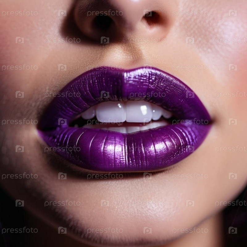 Клубовый снимок женских губ с мерцающей фиолетовой помадой, которая добавляет прикосновение глянцевого оттенка. Губы слегка расставлены между собой, открывая вид белых зубов. чувственность и сексуальность генерируются