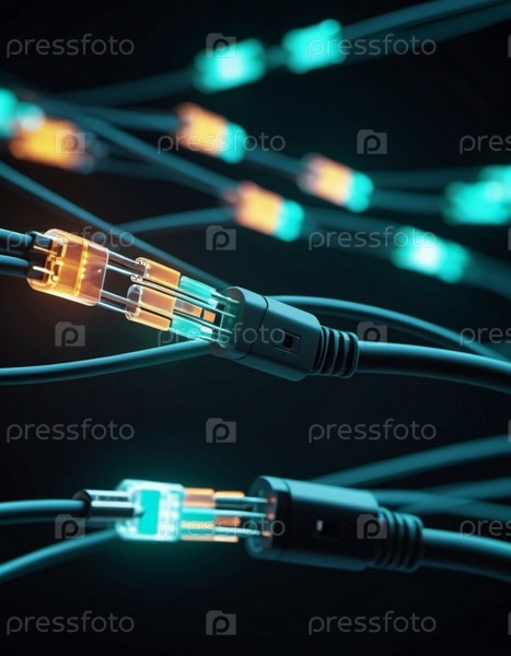 Синие и оранжевые светящиеся провода скручиваются и переплетаются на темном фоне с боке.Черные кабели и разъемы со светящимися огнями и цепями соединяются, образуя сеть