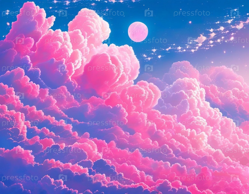 Красивые розовые пушистые облака на ярком закате солнца. Визуальный дисплей. Драматические нереальные небеса с кумулярными и пластовыми облаками в атмосфере. Неизвестная планета с розовыми облаками, луна, планеты и звезды. Искусство