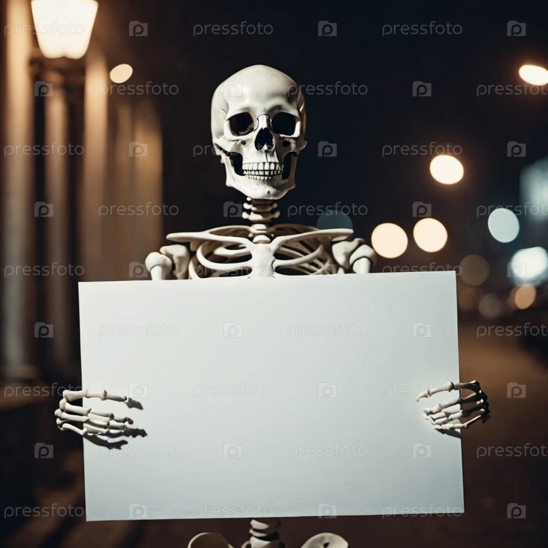 Фигура скелета держит белый плакат. Сгибающиеся руки скелета предоставляют достаточно места для любого сообщения или дизайна