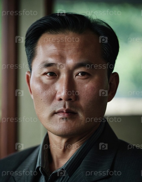 Северокорейский мужчина средних лет изображен с серьезным выражением лица в официальной одежде, внутри внутреннего пространства, которое отражает культуру и окружающую среду региона