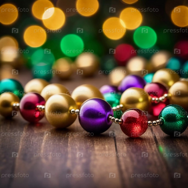 Красочные бусы в фиолетовом, зеленом и золотом цветах создают праздничную атмосферу, когда они лежат на сверкающем фоне боке, воплощая радостный дух новогодних каникул Марди Граса в Новом Орлеане
