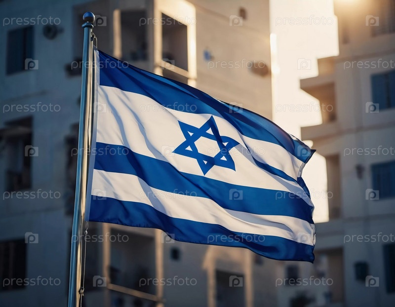 Израильский флаг. просыпается на ветре, с синими и белыми полосами и звездой Давида в центре. ощущение движения и энергии. генерируется ИИ