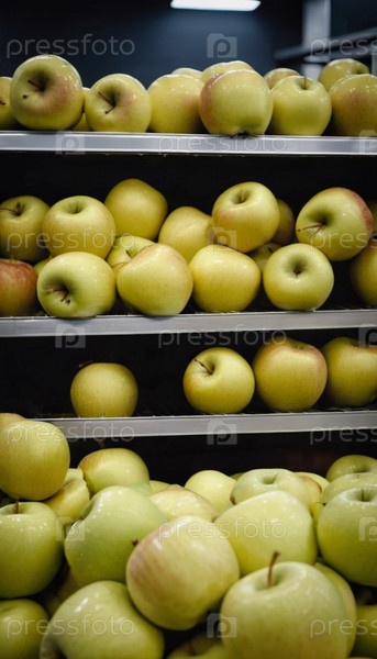 Красочный ассортимент желтых яблок аккуратно размещен на прилавке супермаркета, приглашая клиентов исследовать и выбирать свежие фрукты