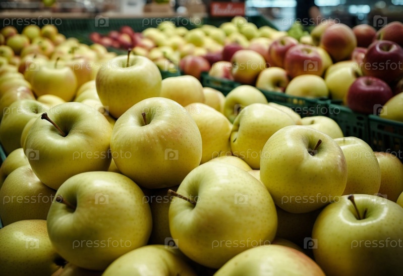 Красочный ассортимент желтых яблок аккуратно размещен на прилавке супермаркета, приглашая клиентов исследовать и выбирать свежие фрукты