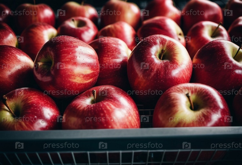 Красочный ассортимент красных яблок аккуратно размещен на прилавке супермаркета, приглашая клиентов исследовать и выбирать свежие фрукты